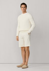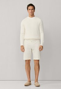 Hombre que lleva pantalones cortos color crema hasta la rodilla, alpargatas beige claro y un suéter de canalé color crema, de pie contra un fondo liso.