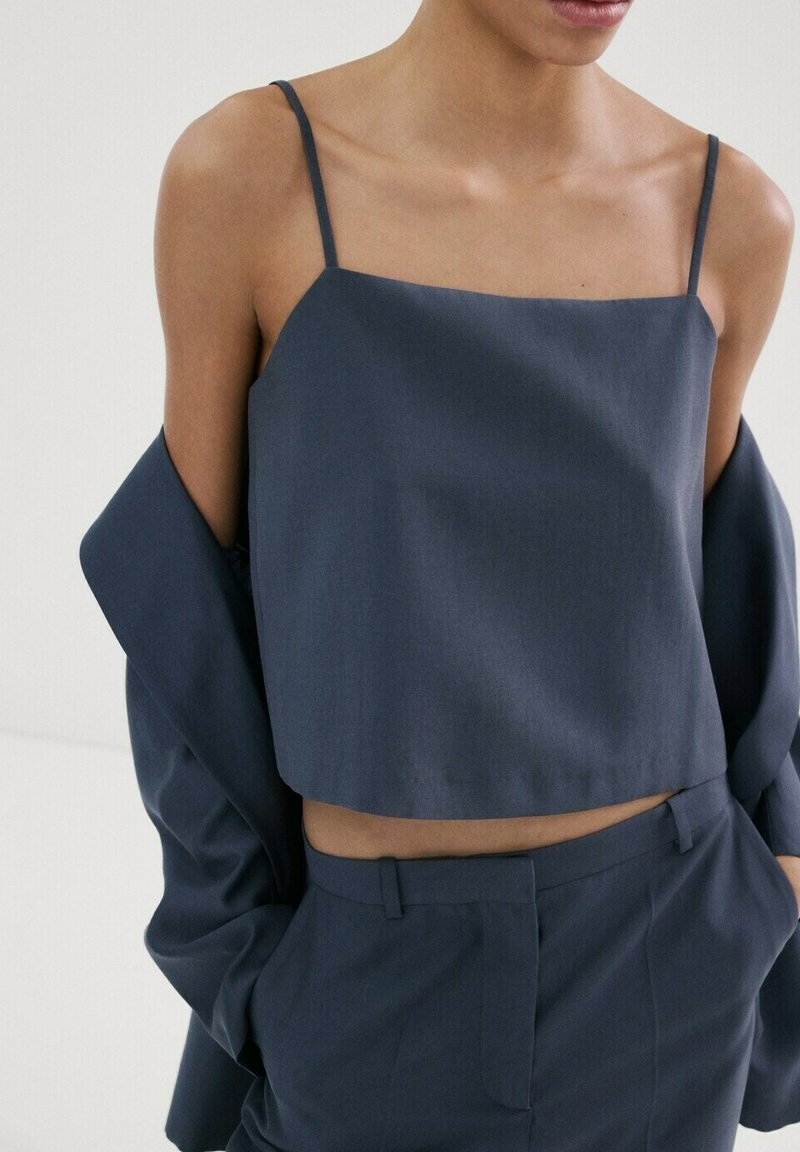 • Mujer con camisola corta azul marino y pantalones de talle alto a juego, con un blazer suelto colgado en los brazos.