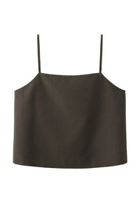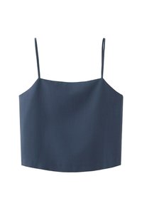 • Camiseta corta azul marino con tirantes finos de espagueti y escote recto sobre un fondo blanco.